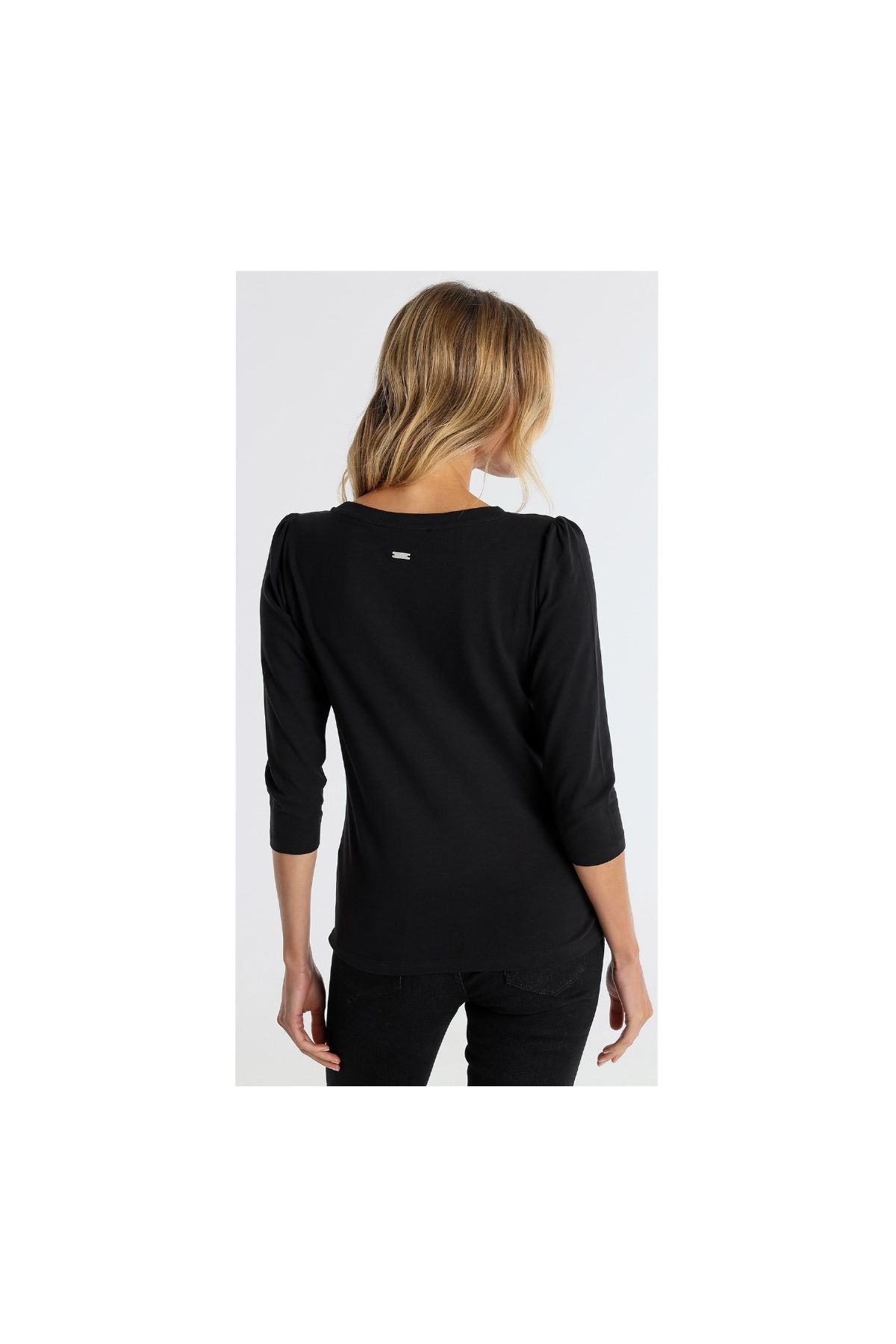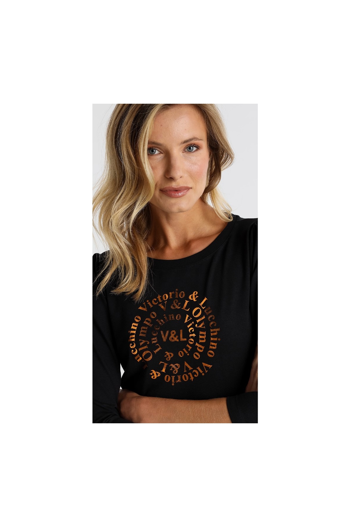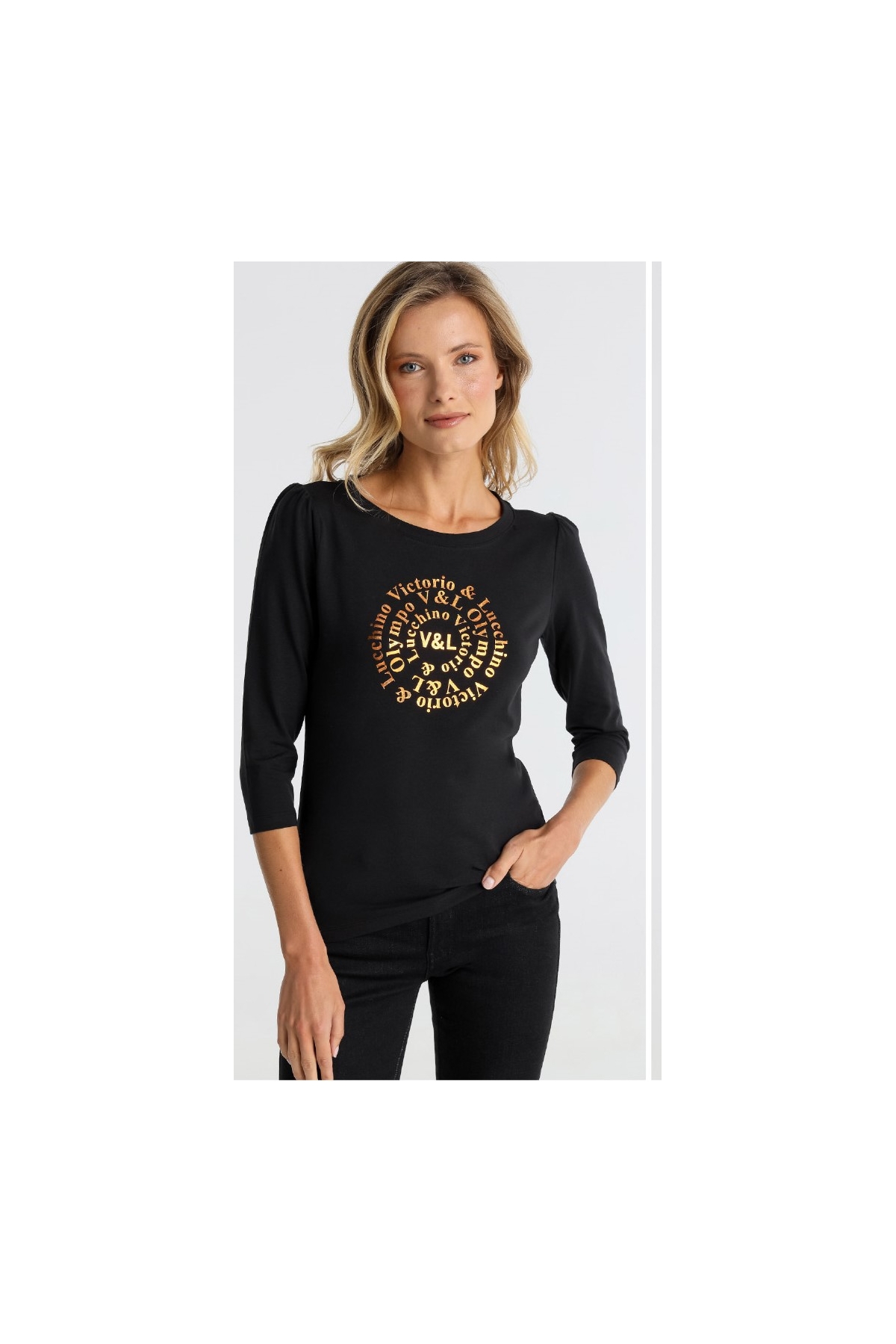 Camiseta de algodón negra de V&L. De manga francesa con logo dorado, es muy estilosa y favorecedora. Es una camiseta básica que te proporcionara un look ideal.
