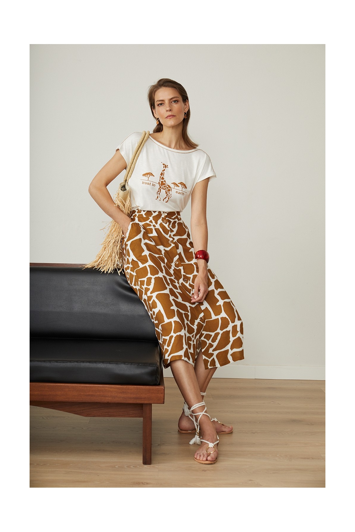 Falda midi estampada de Paz Torras. Abierta de arriba a bajo con botones y con bolsillos. Tiene un tejido muy fresco. Estampado de jirafa en oro oscuro y blanco.