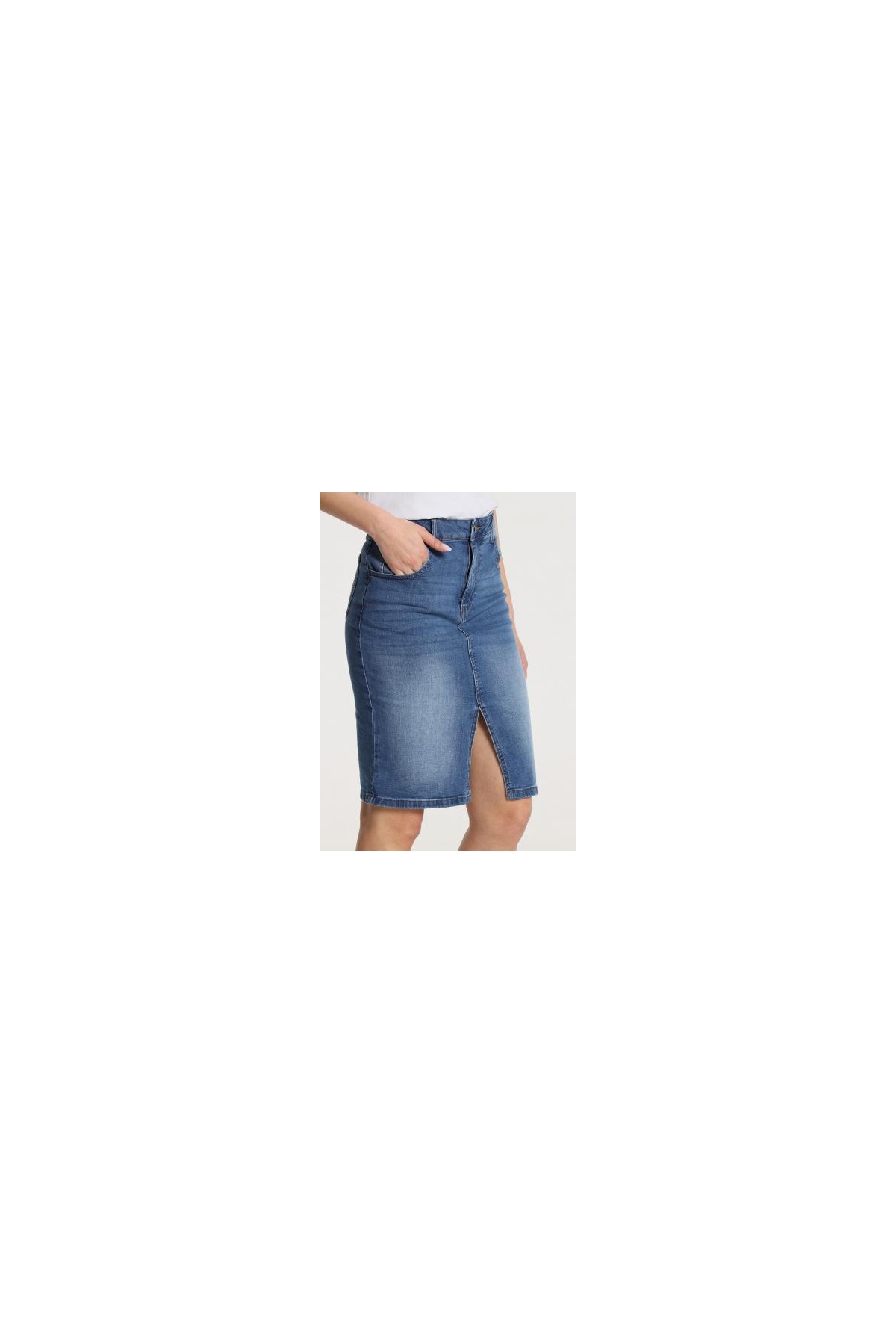Falda vaquera de V&L. Tubo con abertura adelante, elástica. Un fondo de armario super estilosa y favorecedora, no puede faltar en tu armario