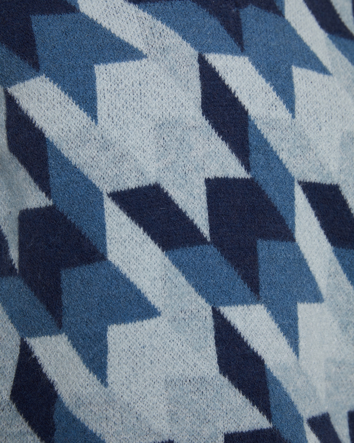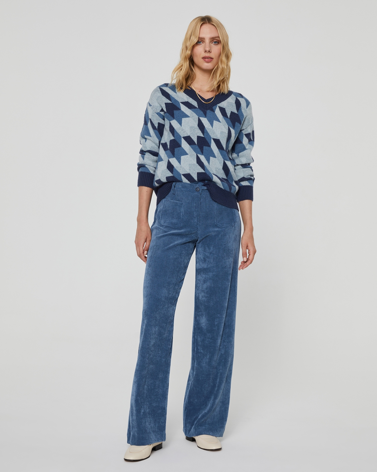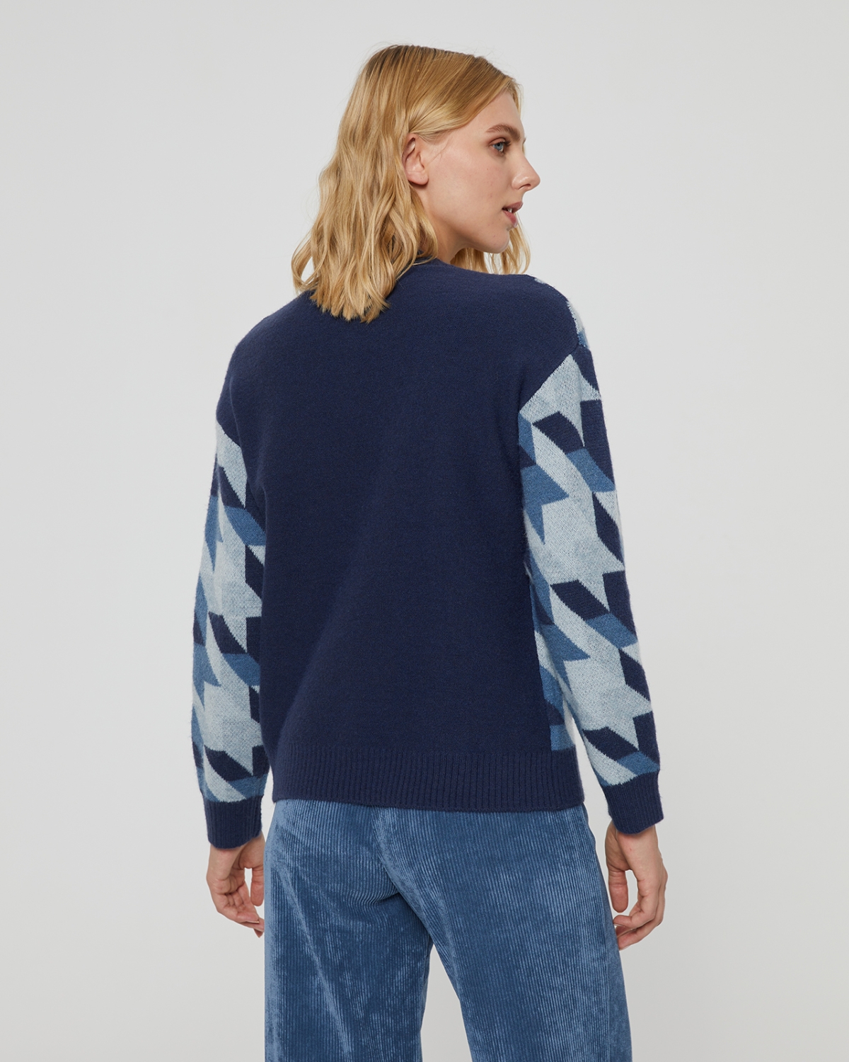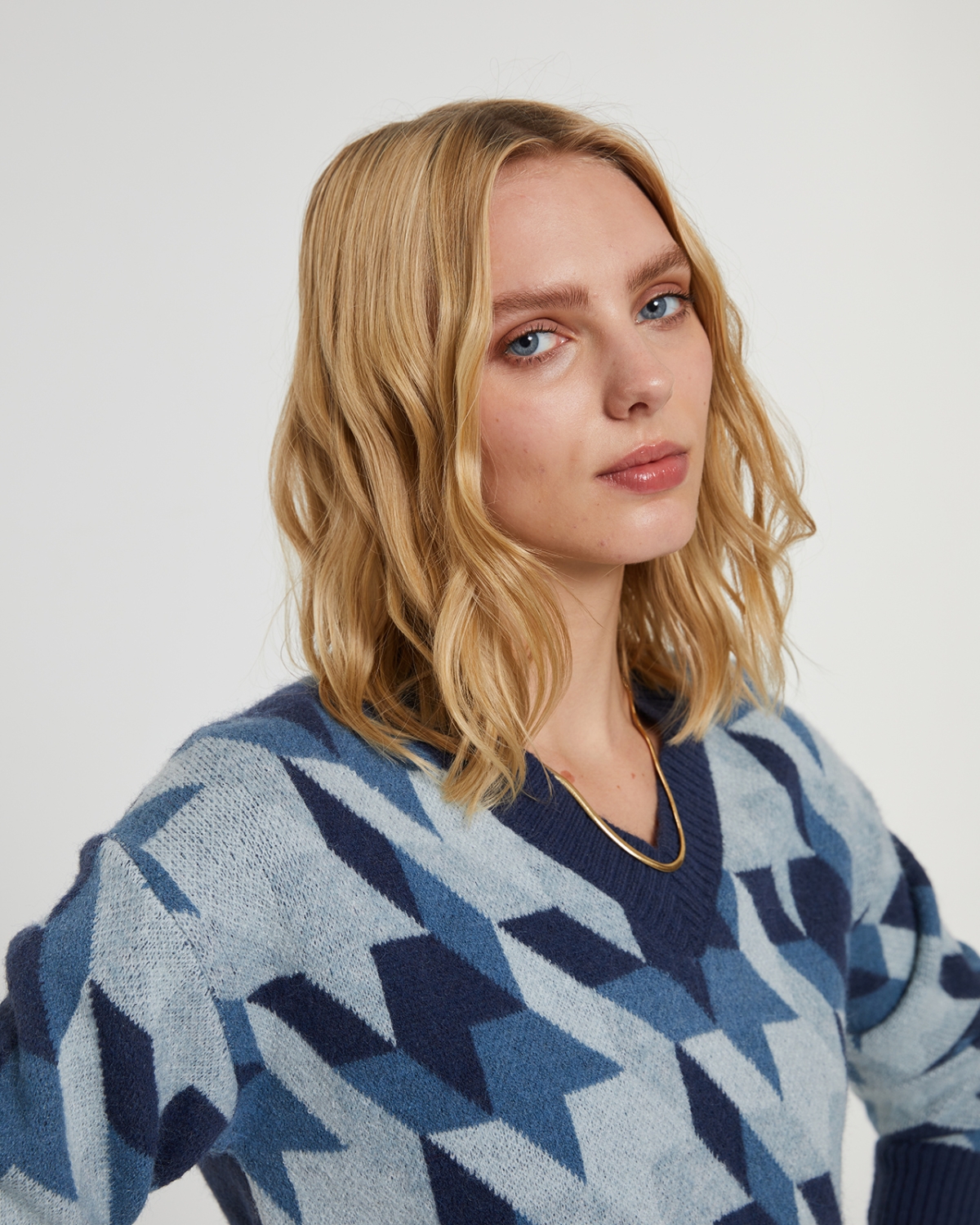 Jersey de pico azul de Paz Torras. Con dibujo por delante y las mangas y espalda lisa.