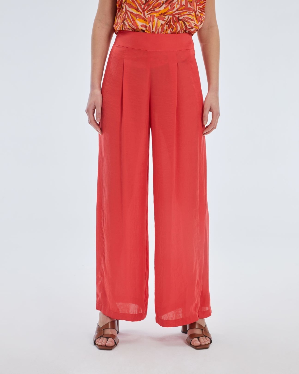 Pantalón palazzo de mujer con pinzas de Paz Torras. De raso, cruzado con aberturas, es un pabtalón con mucho movimiento.