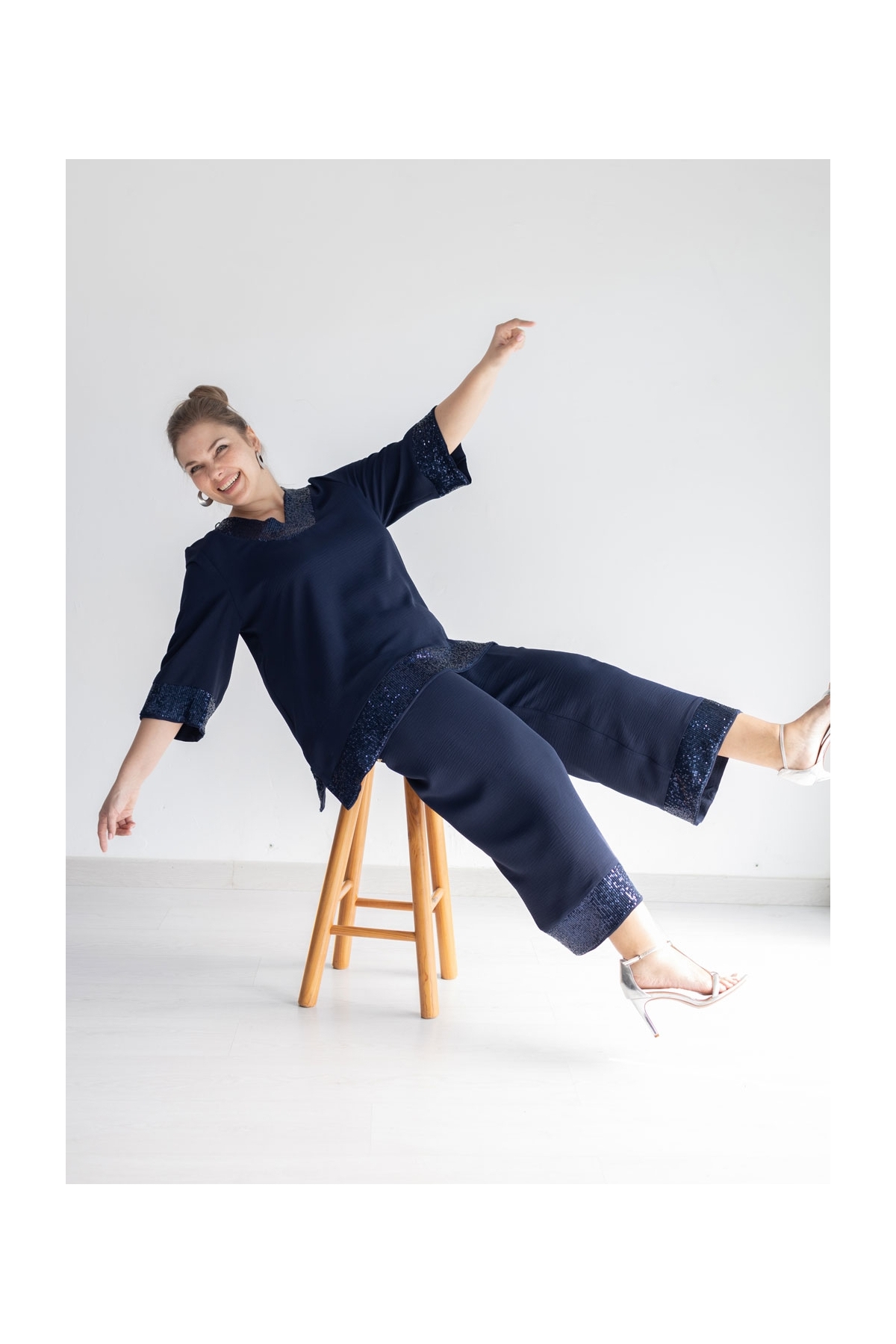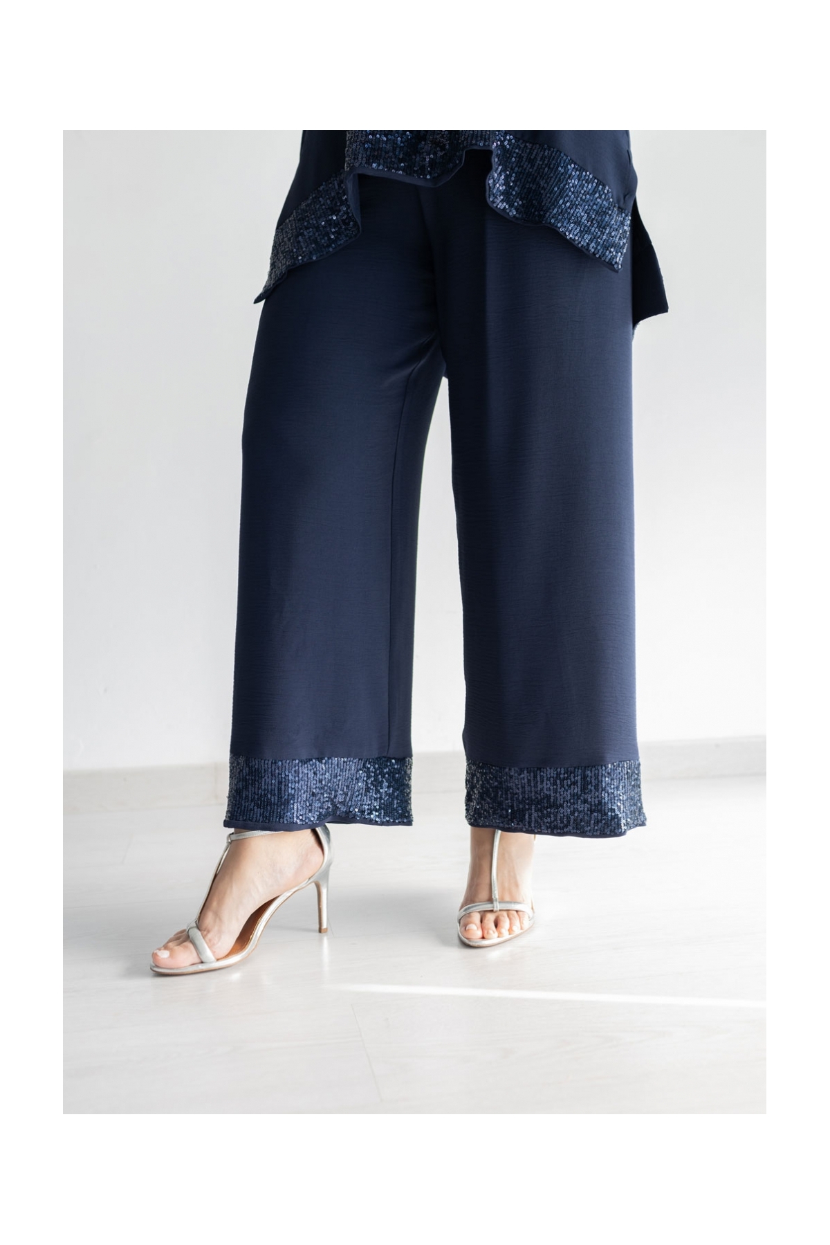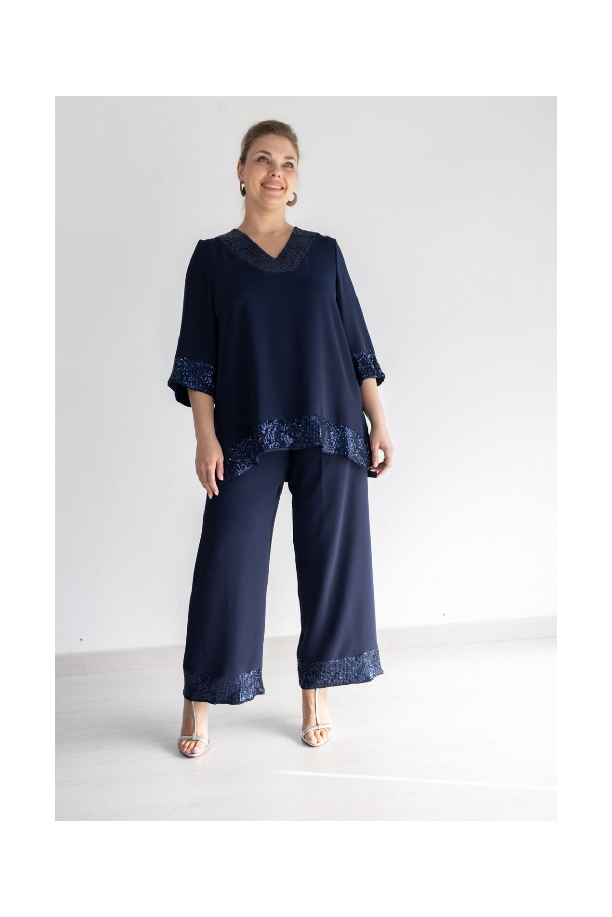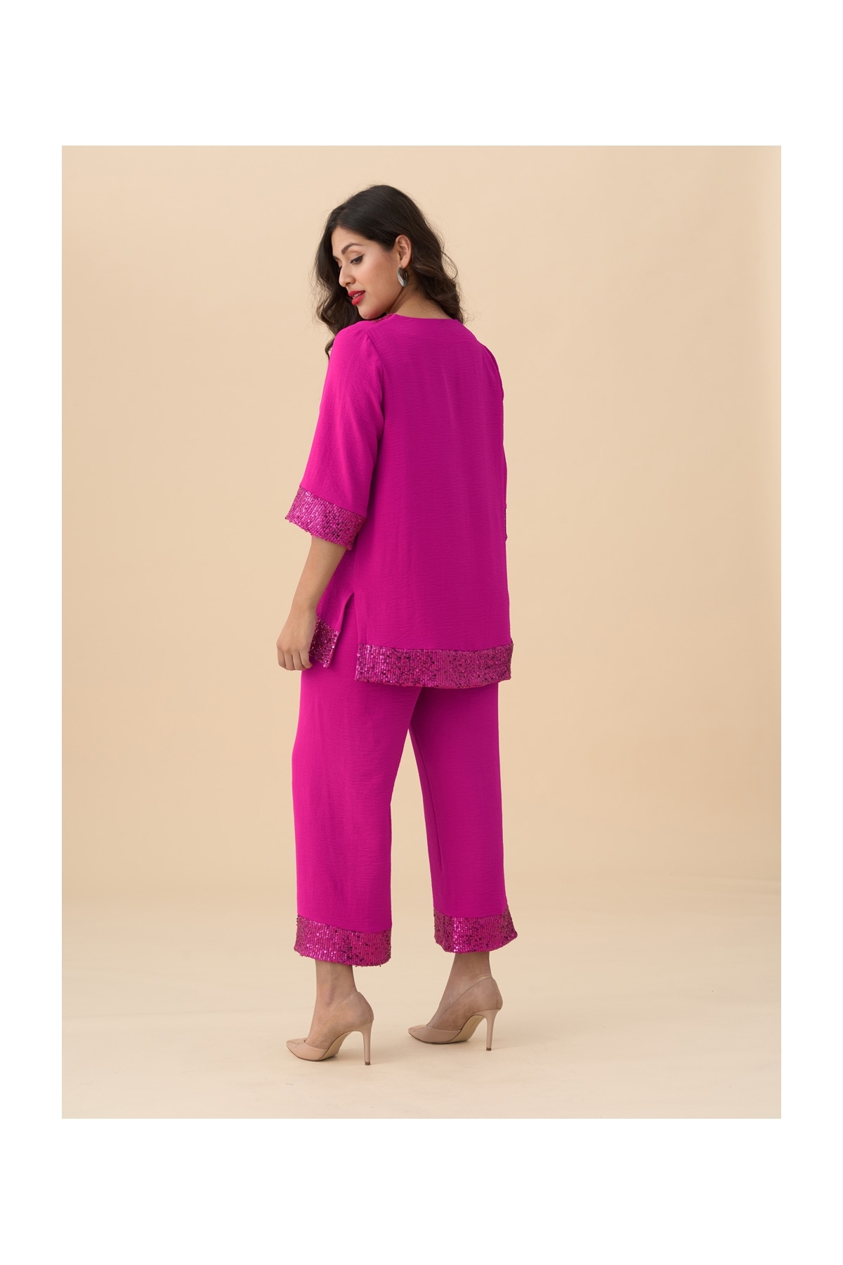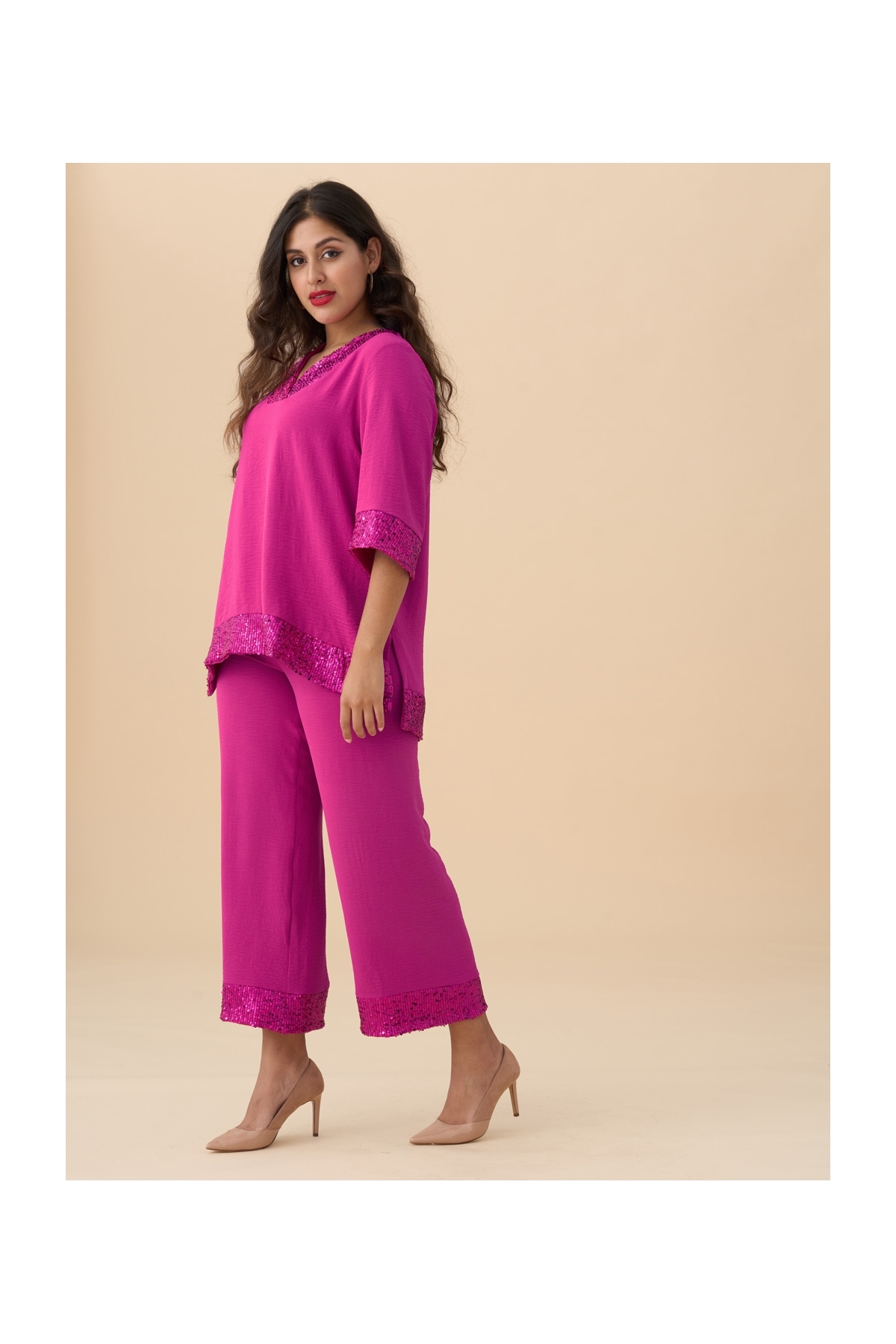 Descubre el glamour con nuestro conjunto de fiesta de 2 piezas. Blusa y pantalón ancho en tejido de plana granulado, con banda de lentejuelas en escote, mangas y bajo.