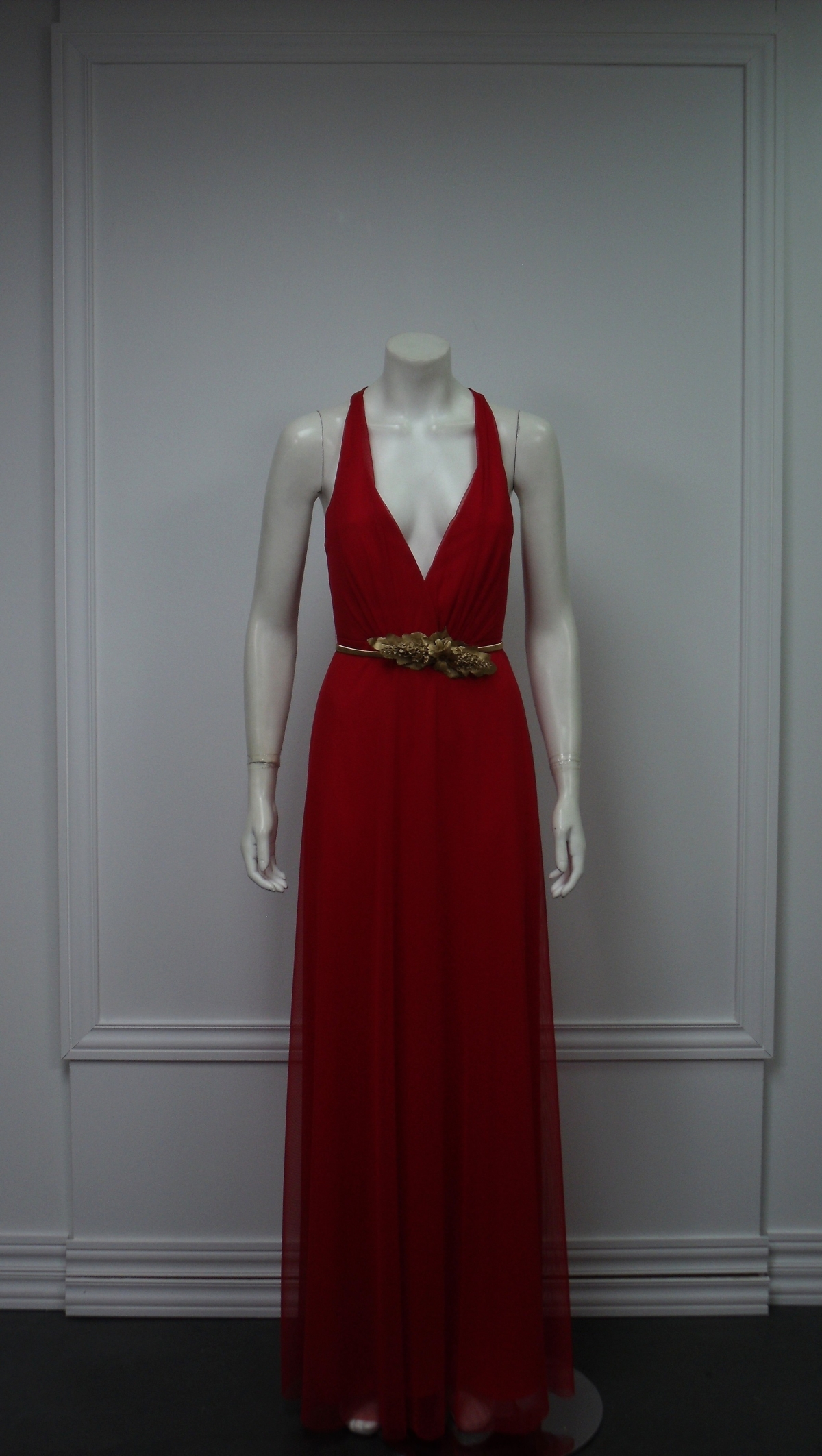 Vestido largo de fiesta. Tejido: tul. De tirante fino, escote cruzado pico. Titantes cruzados en espalda descubirta. Color rojo.