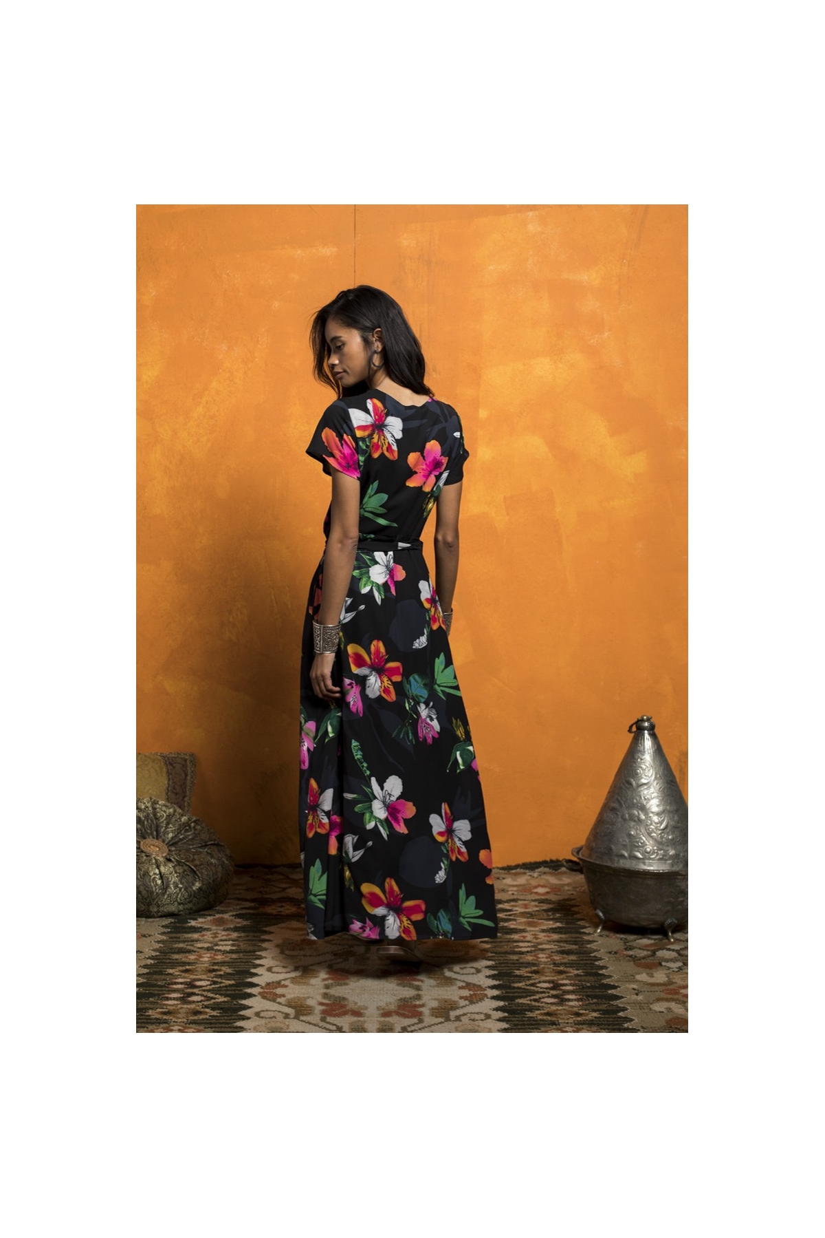 Vestido largo de vuelo estampado de gasa. Fondo negro con flores grandes de colores. Manga corta con vuelo, escote de pico cruzado. Corte en la cintura
