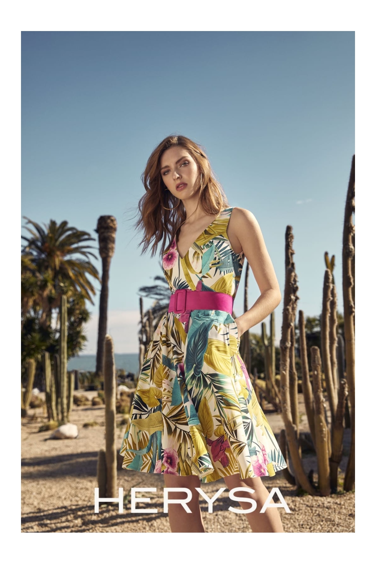 Vestido corto estampado de fiesta. De tirante con escote pico. Falda de vuelo, tipo velvet, con bolsillos. Cinto rigido con hebilla. Disponible únicamente con estampado en azul marino, más favorecedor