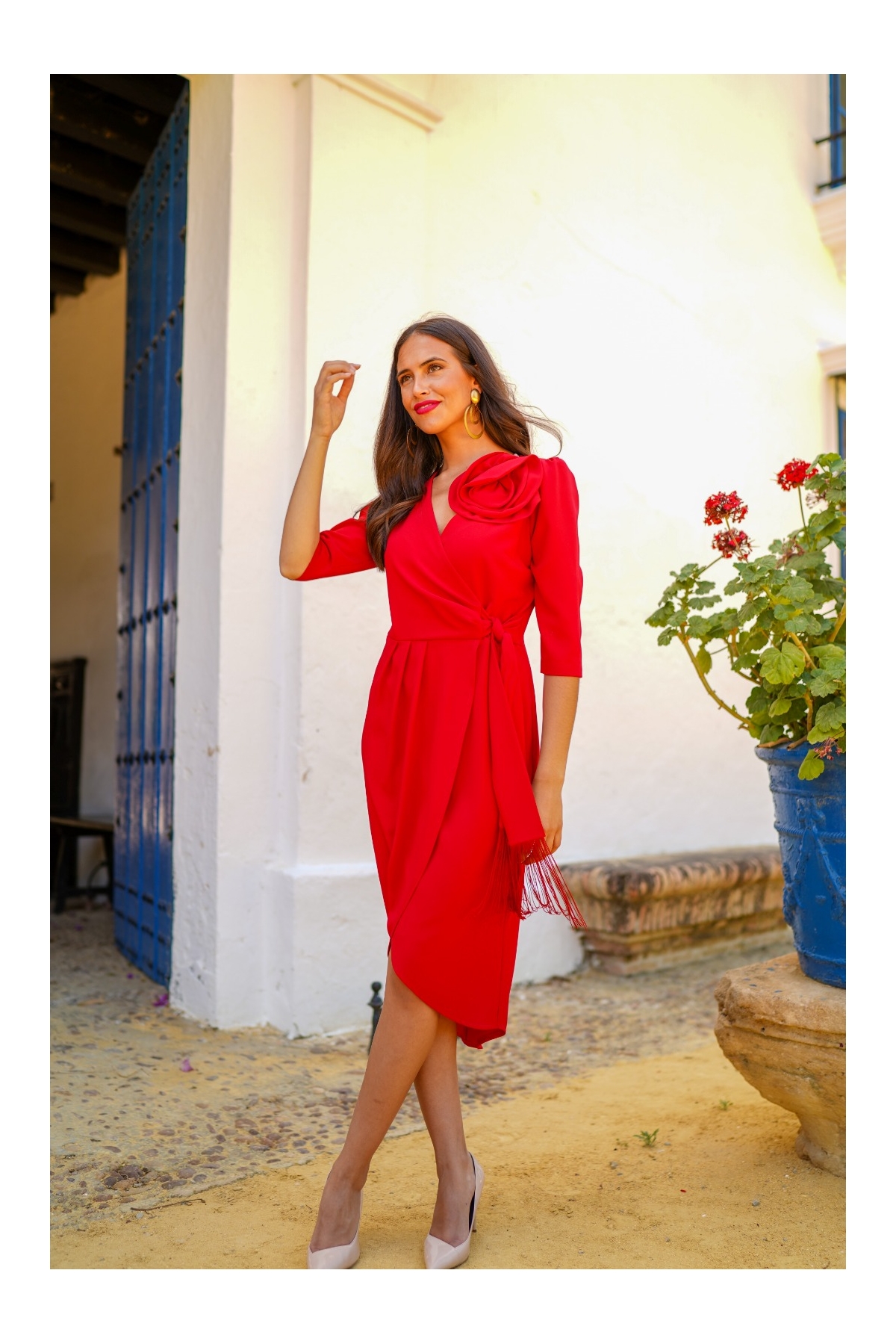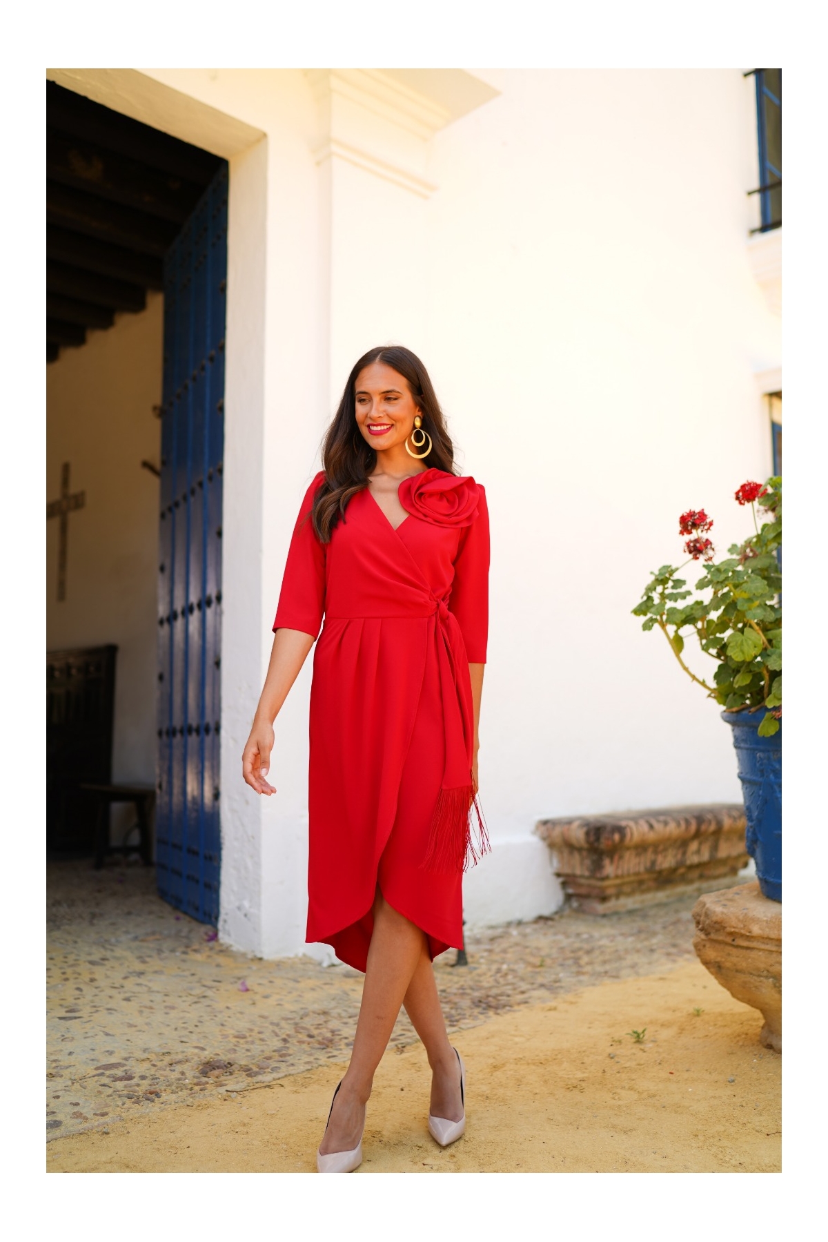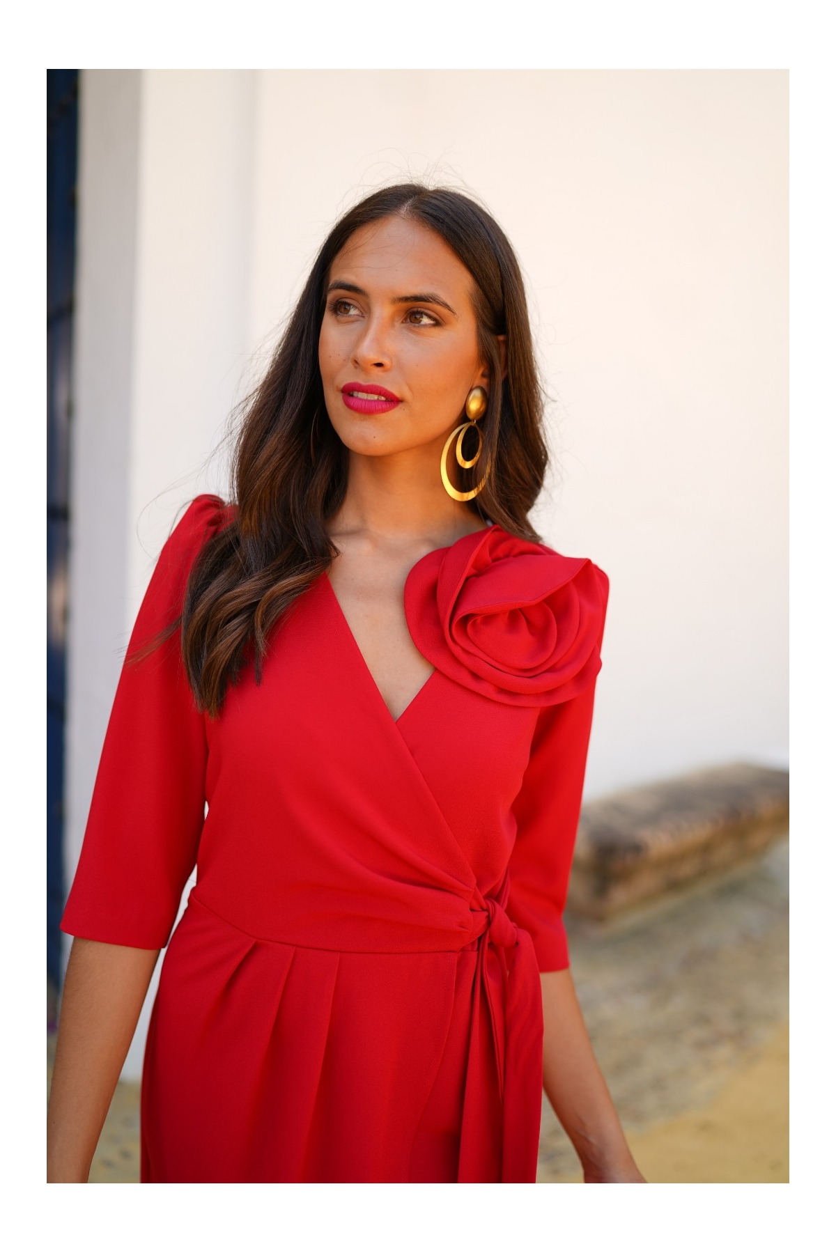 01152906 VESTIDO ROJO MIDI LISO CRUZADO FLOR 626018