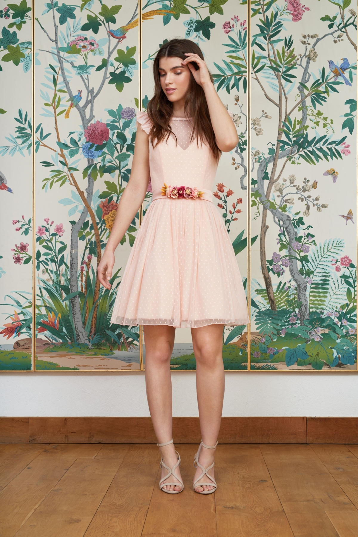 Vestido corto de plumeti de fiesta. Escote espalda. Únicamente disponible en color amarillo, muy favorecedor. Cinto dorado de cuerda con adorno de flores.